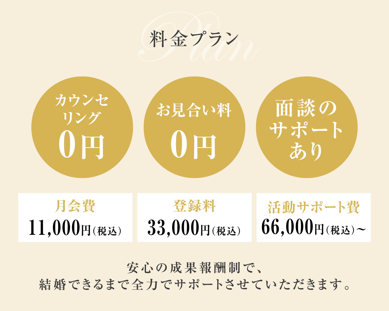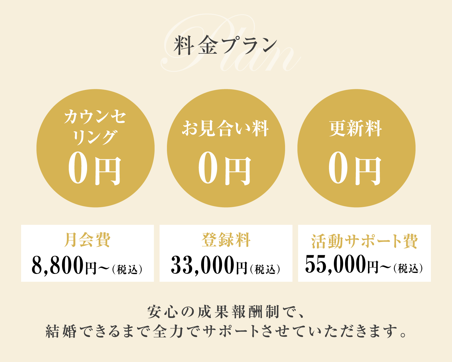 当社のアドバイザーは婚活カウンセラーとしての長年の経験があり、担当の会員様のご成婚実績は約100名以上。その経験値と実績の高さで、婚活初心者の方から、何をやってもうまくいかない方まで、老若男女問わず成婚までしっかりと導きます。