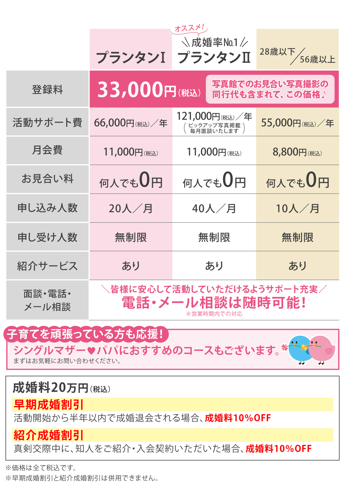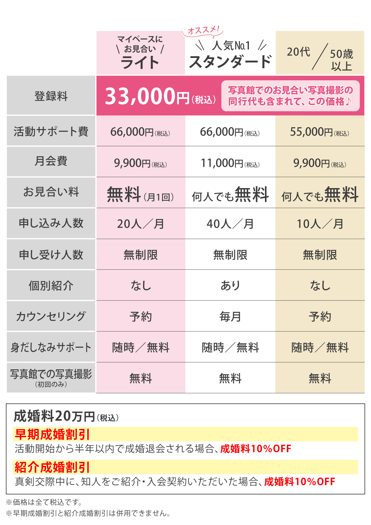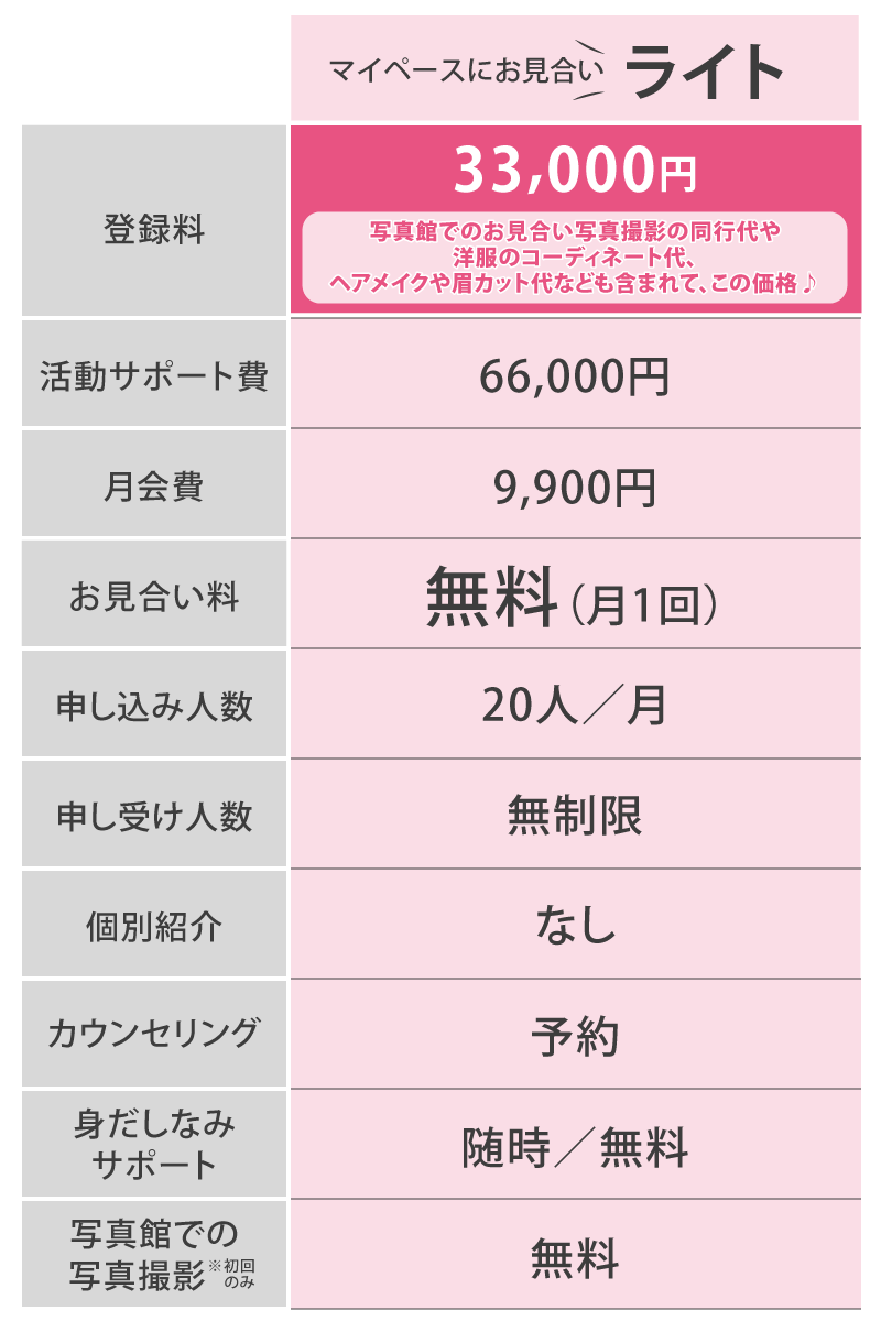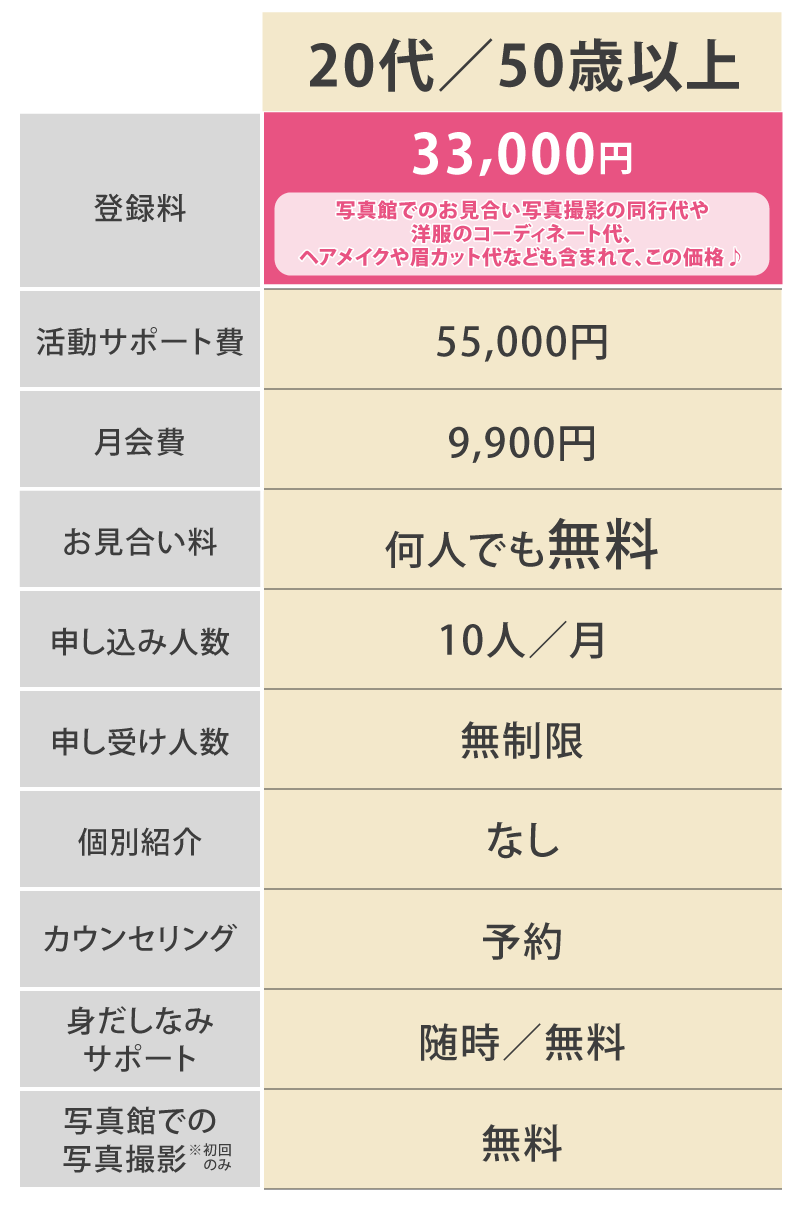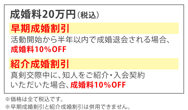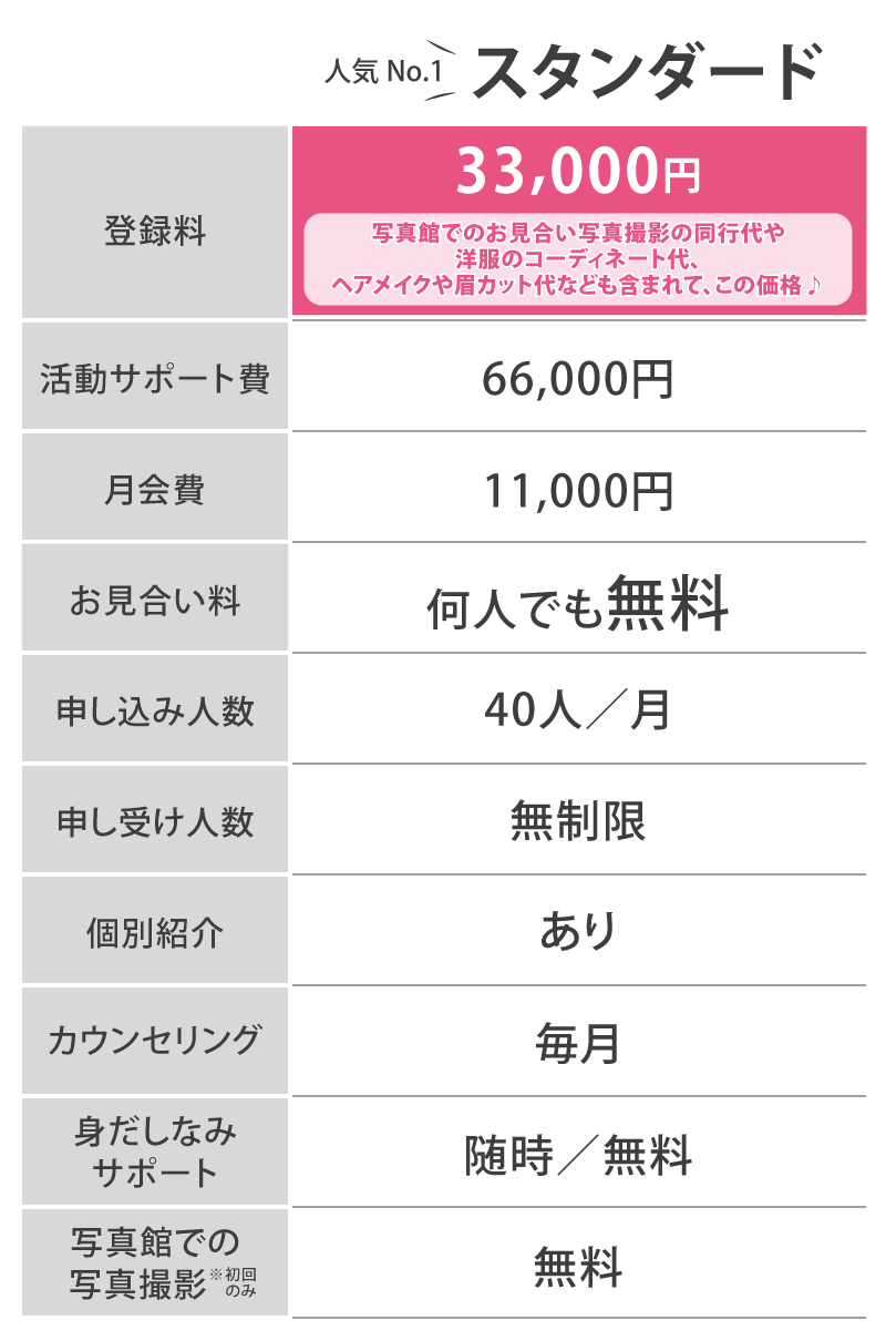 諸注意 ※登録料はプロフィール作成やお見合い写真の撮影など、お見合いシステムに登録するための料金です。 ※活動サポート費とは、成婚に向けたさまざまなサポートを受けるために必要な費用のことです。 ※成婚料とは、成婚に至ったときに頂く料金です。結婚、婚約またはそれらと同等の成果があったとき成婚とみなします。 ※中途解約の際の返金制度に適応しています。(登録料を除く)